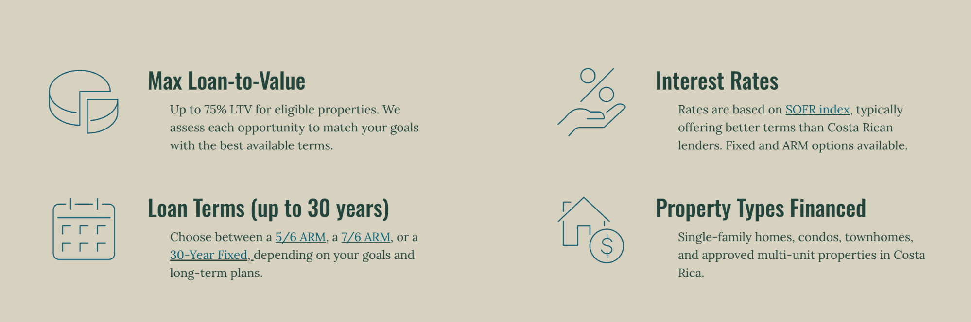 Volo Loans is a U.S.-based lender specializing in mortgages for Costa Rican properties. Unlike traditional Costa Rican banks, Volo operates within the U.S. financial system, using your U.S. credit history and income to qualify. This makes it easier for Americans to finance real estate abroad.
